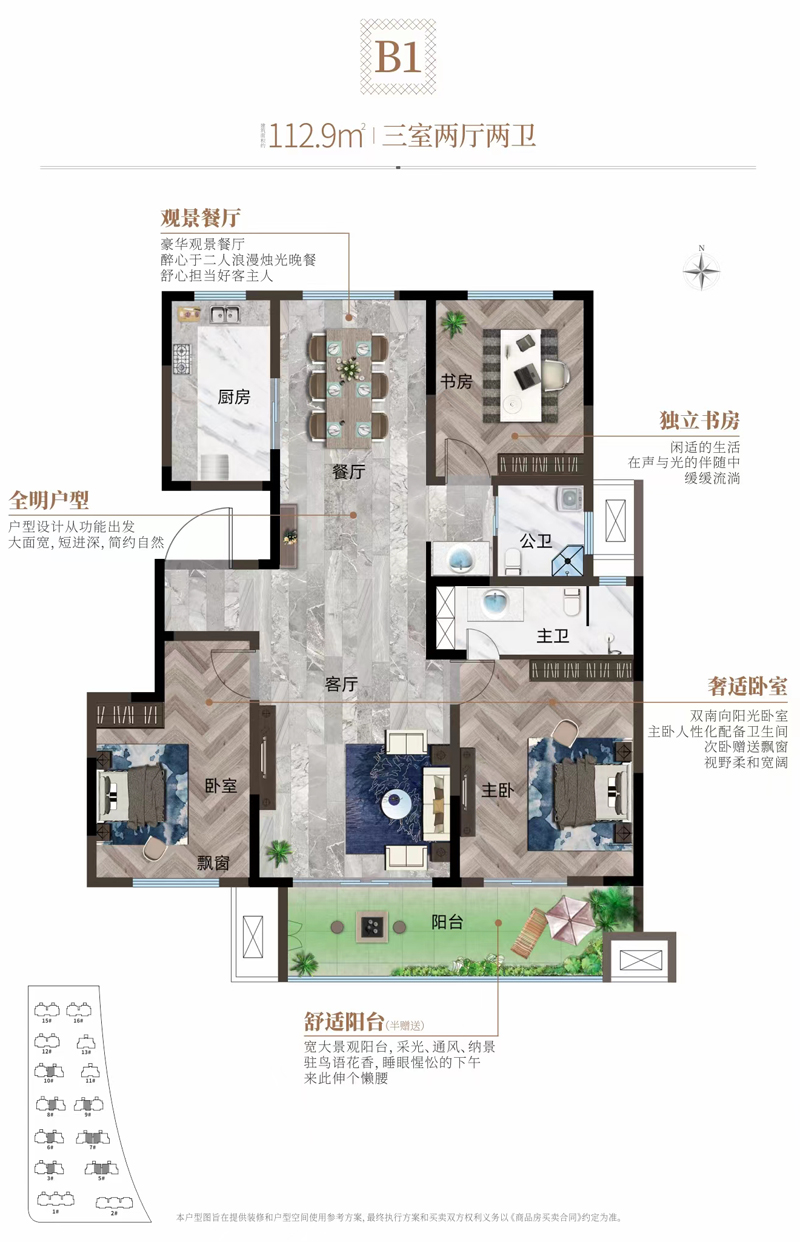 項(xiàng)目共計(jì)規(guī)劃14棟樓,都是一梯兩戶7-8層電梯洋房,超寬樓間距??傆玫孛娣e30189㎡,地上45360㎡,規(guī)劃430戶,建筑密度為:25.01%,綠地率為:30.21%,車位配比1:1,容積率1.49。